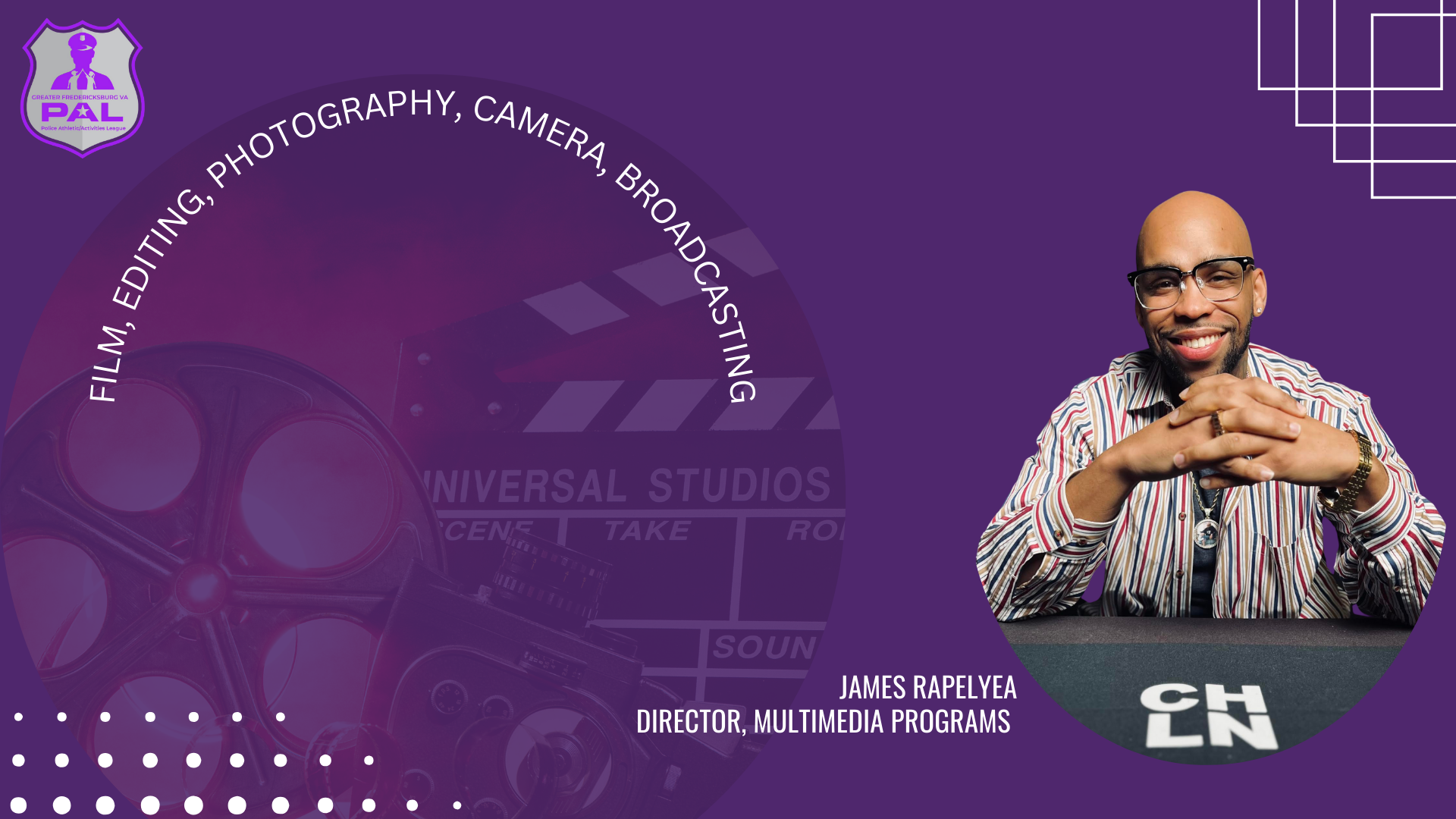 The Greater Fredericksburg Virginia PAL, multi-media program will provide a tremendous opportunity for our members to receive a foundational practical and vocational opportunity in the multi-media world. The program provides instructional learning, hands-on training, internship, apprenticeship opportunities and networking.